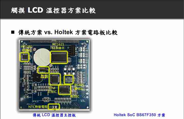 2.HOLTEK单一颗主控MCU中内含时钟功能,LED显示功能,与外部通讯功能,触控功能,内置热敏电阻功能以及内置晶振,为整体PCBA的设计更为紧凑,结构与生产会更为便利。